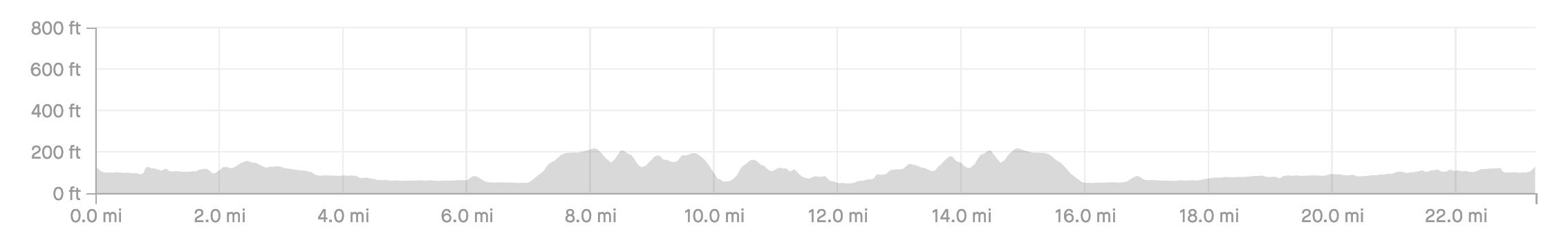 The 23 miles are packed with a great variety of scenery and road surfaces. The route contains a combination of singletrack, double-track, and country back roads with views of farmlands, woodlands, pine groves and fields.